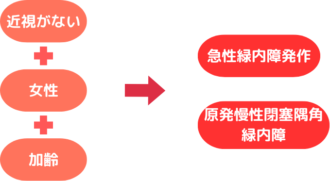 ここで急性緑内障発作を起こしやすい方の属性をまとめます。近視がない、すなわち遠視か正視の方で、若い頃からメガネを使わなくても良く見えていた女性が、中高年期になったときに発症するリスクが高い傾向があります。