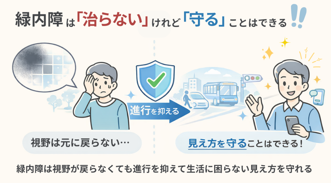 緑内障は「治らない病気」ですが、正しく治療すれば「一生困らない見え方」を守ることができます。