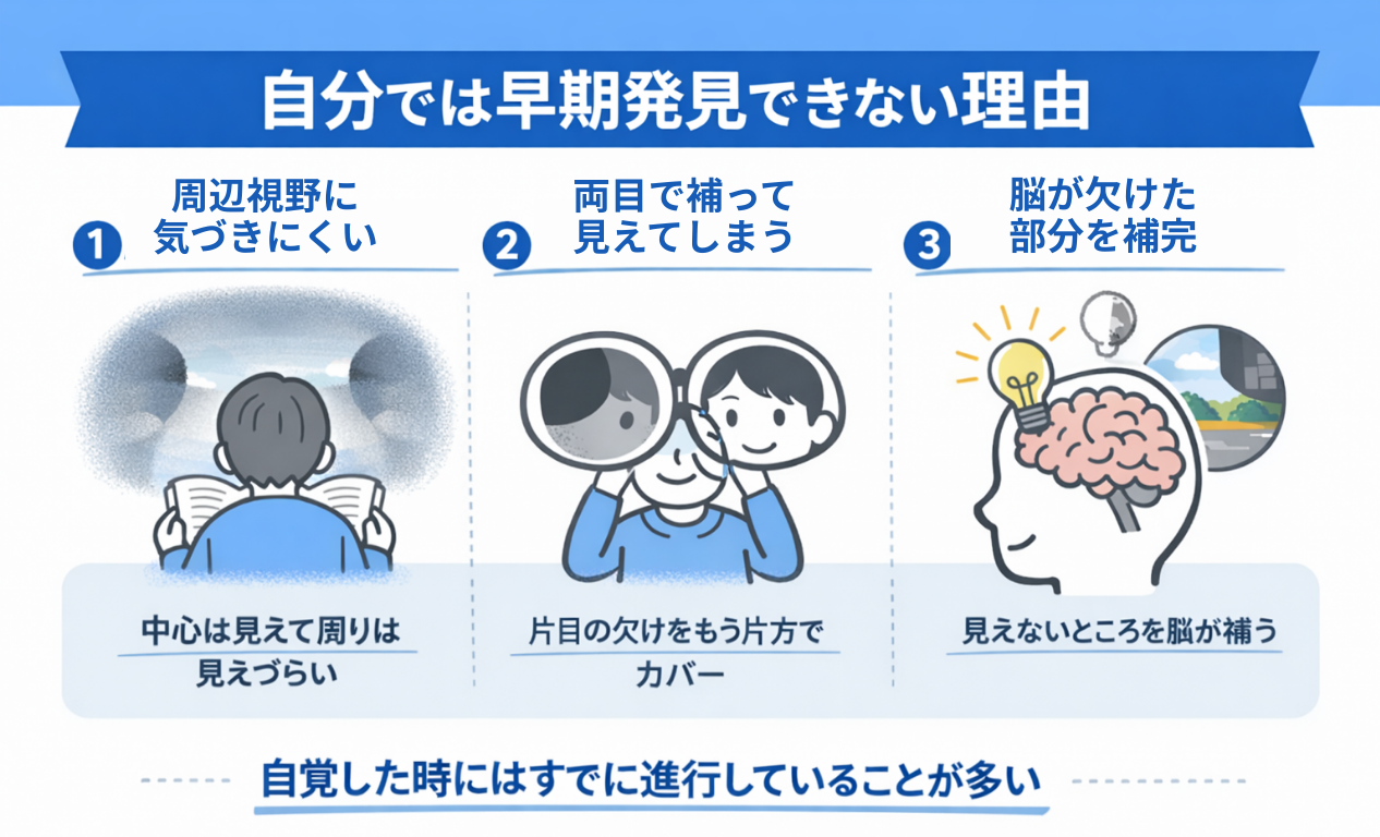 この働きにより、本人は「見えていない場所がある」こと自体に気づかずに生活できてしまいます。その結果、自覚症状が出たときには、すでに進行しているというケースが少なくありません。