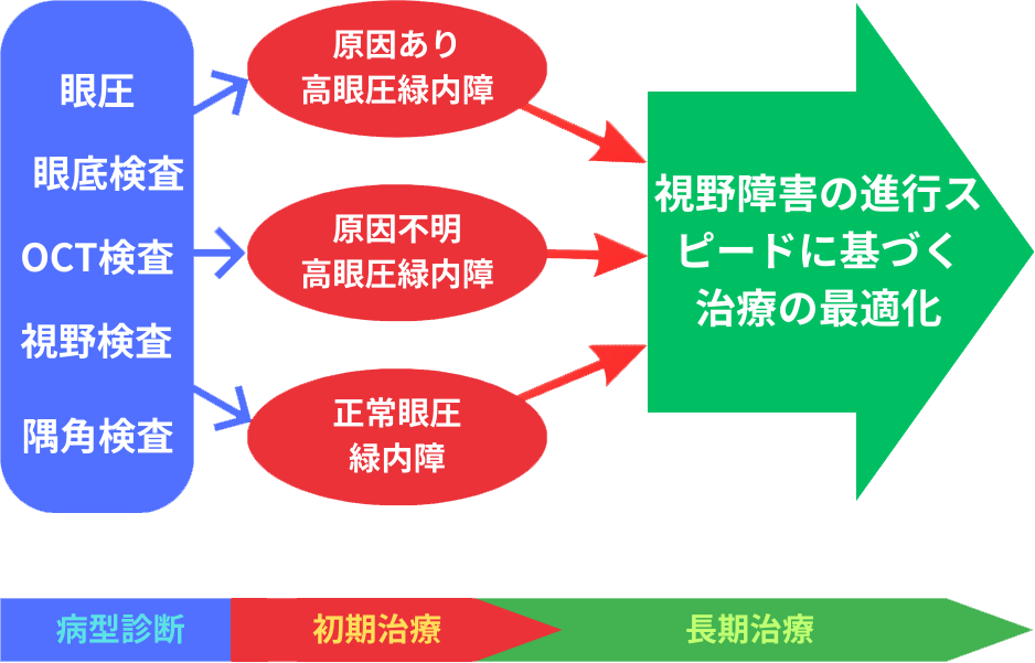しかし、緑内障のタイプにより初期の治療アプローチは異なります。このため、適切な診断を行い、適切な初期治療を行うことが大切です。もちろん、これは眼科医の仕事ですが、患者さんも理解のベースとして大枠を知っていただくとよいでしょう。